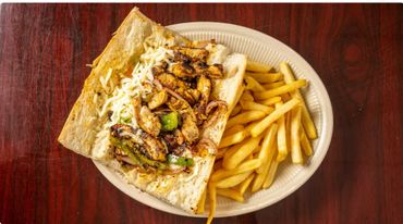 Served on a warm pita with onions, peppers, lettuce, and tomatoes.