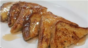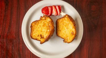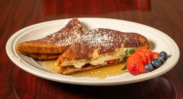 Classic French toast with sweet cream cheese filling and seasonal berries. Topped with powdered sugar and syrup.
