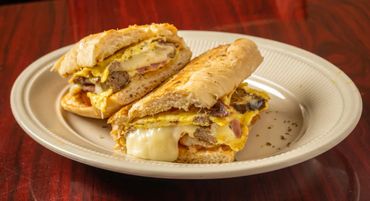 Eggs, thinly sliced rib-eye, American white cheese, onions, and peppers, served on Cuban toast.