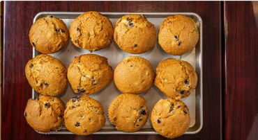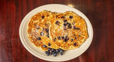 Three large, fluffy pancakes with your choice of blueberries, chocolate chips, or toasted almonds.