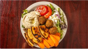 Crispy falafel, homemade hummus, lettuce, tomato, and pickles wrapped in a pita.