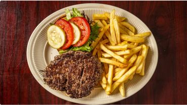 Juicy half-pound beef patty with fresh lettuce, tomato, and cucumber slices. (add cheese for 1.00 or bacon for 2.00)
