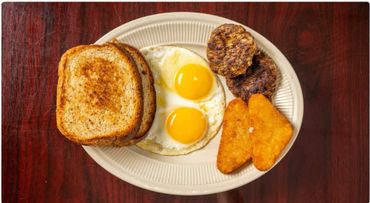 Eggs, turkey bacon, turkey sausage, turkey ham, white American cheese, hash browns, and hot sauce (optional). Served on Cuban toast.